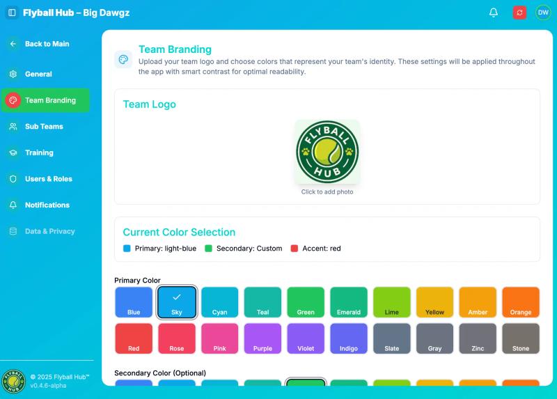 Make Flyball Hub your own by setting your team's colours and adding your logo, important files and links. More customisation to come!
